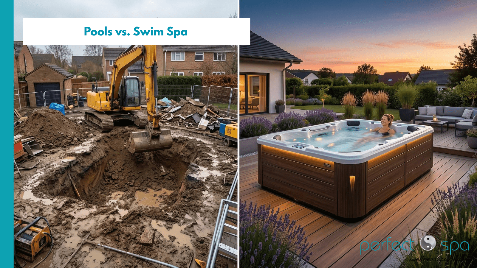 Links: Die chaotische Realität des klassischen Poolbaus. Rechts: Die saubere, smarte Alternative – ein freistehendes Swim Spa.