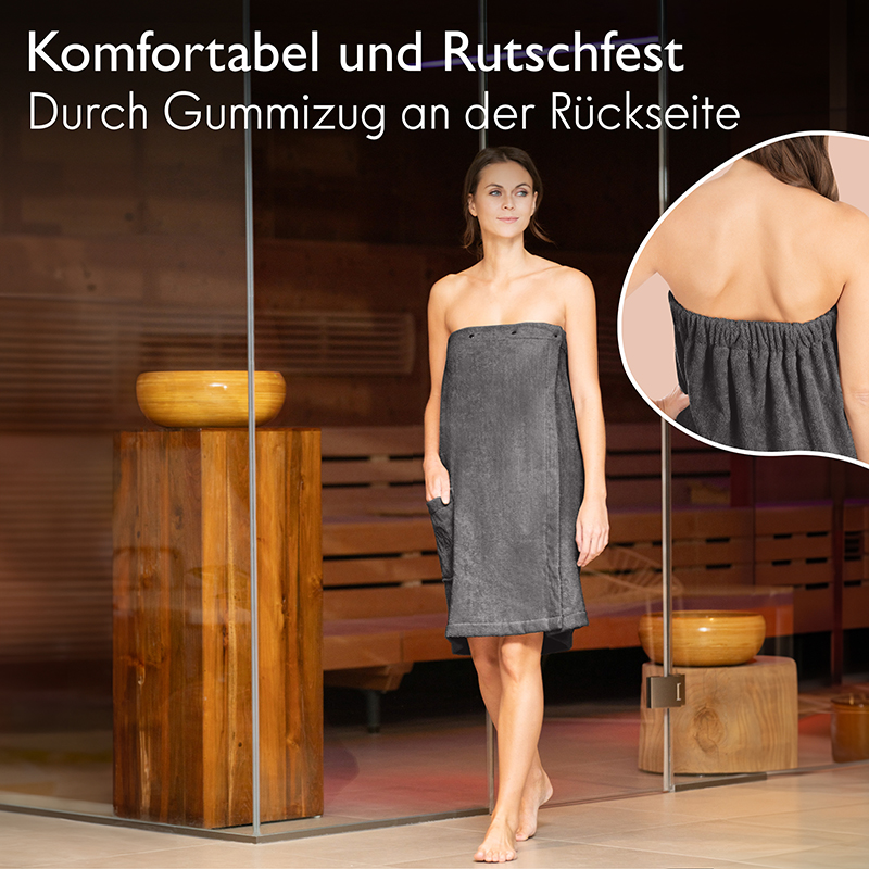 Sie haben keine Lust in der Sauna ständig an Ihrem Handtuch rumzuzuppeln? Wir haben die perfekte Lösung. Die Saunakilts ermöglichen Ihnen einen besonderen Tragekomfort und sind sehr weich auf der Haut. Zudem sind sie durch die Knöpfe an der Vorderseite individuel einstellbar und der Gummizug an der Rückseite sorgt für flexibilität und garantiert kein rutschen.