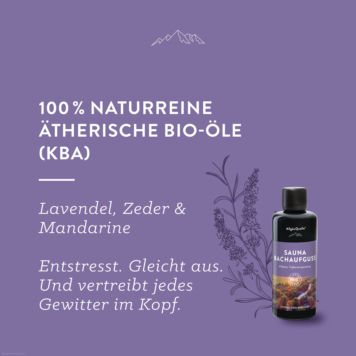 Mit dem Sauna Duftöl “Bachaufguss” erhalten Sie die Frische der Allgäuer Natur in Ihrer Sauna. Die Mischung aus Lavendel, Zirbe und Mandarine beleben Ihren Geist. Das Saunieren soll der Abhärtung gegen Erkältungskrankheiten dienen und mit dem natürlichen Bioöl „Allgäuer Tiefenentspannung“ machen Sie Ihren Saunagang zu einem ganz besonderem Dufterlebnis.