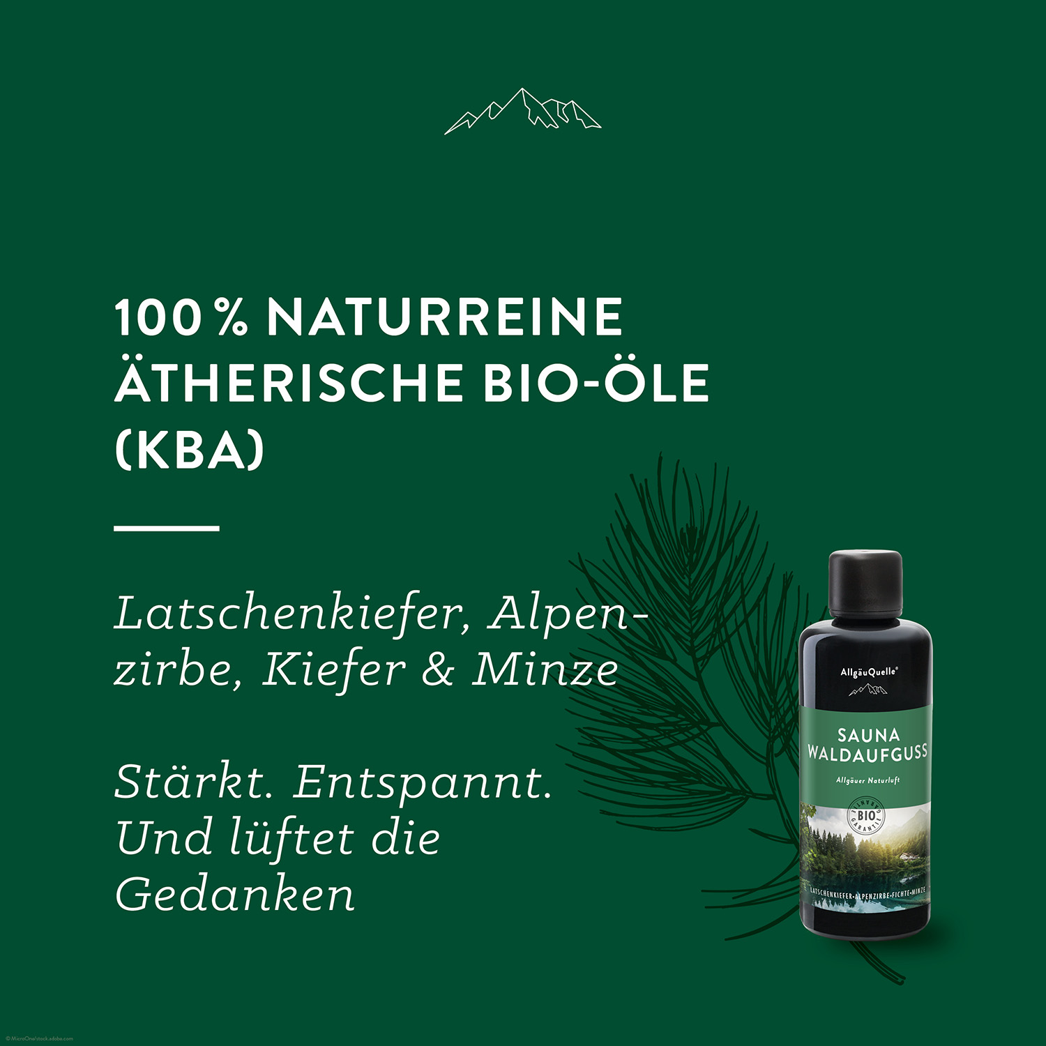 Mit dem Sauna Duftöl „Waldaufguss“ erhalten Sie die Frische der Allgäuer Natur in Ihrer Sauna. Die Mischung aus Latschenkiefer, Alpenzirbe, Fichte und Minze beleben Ihren Geist. Das Saunieren soll der Abhärtung gegen Erkältungskrankheiten dienen und mit dem natürlichen Bioöl „Allgäuer Naturluft“ machen Sie Ihren Saunagang zu einem ganz besonderem Dufterlebnis.