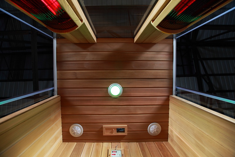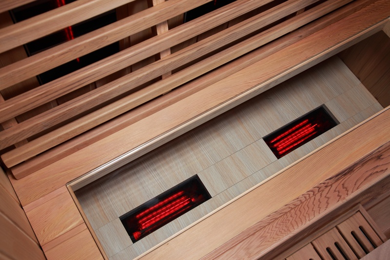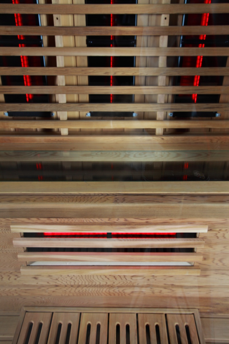 Die Infrarotkabine Madeira ist ausgestattet mit acht Infrarotstrahlern. Davon befinden sich 3 x 300 Watt Strahler auf der Rückseite, 2 x 300 Watt auf der Vorderseite, 2 x 100 Watt unter der Glassitzfläche und 1 x 500 Watt im Wadenbereich. Des Weiteren verfügt die Kabine über eine Fußbodenheizung. Besonders hervorzuheben ist das Design der neuen Sitzmöglichkeit, diese besteht aus Glas unter welchem sich direkt zwei Infrarotstrahler befinden. An den Seiten befinden sich die beiden Schiebetüren. Die Infrarotkabine ist mit einem Kontrollsystem ausgestattet, von hier aus steuern Sie nicht nur die Temperatur und Zeit, sondern haben die Möglichkeit extern angeschlossene Geräte über den USB Anschluss zu hören oder das eingebaute FM Radio zu bedienen. Die in unserer Infrarotkabine verbauten Vollspektrumstrahler erzeugen 27% IR-A (Kurzwellen), 58% IR-B (Mittelwellen) und 15% IR-C (Langwellen). Magnesiumoxidstrahler erzeugen dagegen gerade einmal 5% IR-B und 95% IR-C. Die Leistung dieser Infrarotsauna kann man jeweils in 4 Stufen mithilfe der 2-Zonen Steuerung regulieren. Dies sorgt außerdem für einen geringen Stromverbrauch.