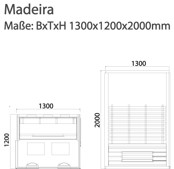 | Abmessungen (BxHxL): | 1200 x 2000 x 1300 mm |