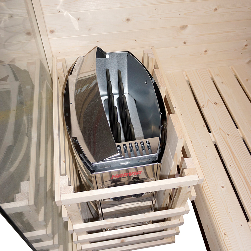 Ein leistungsstarker 8 kW Saunaofen der Marke Harvia sorgt für klassisches Saunavergnügen.