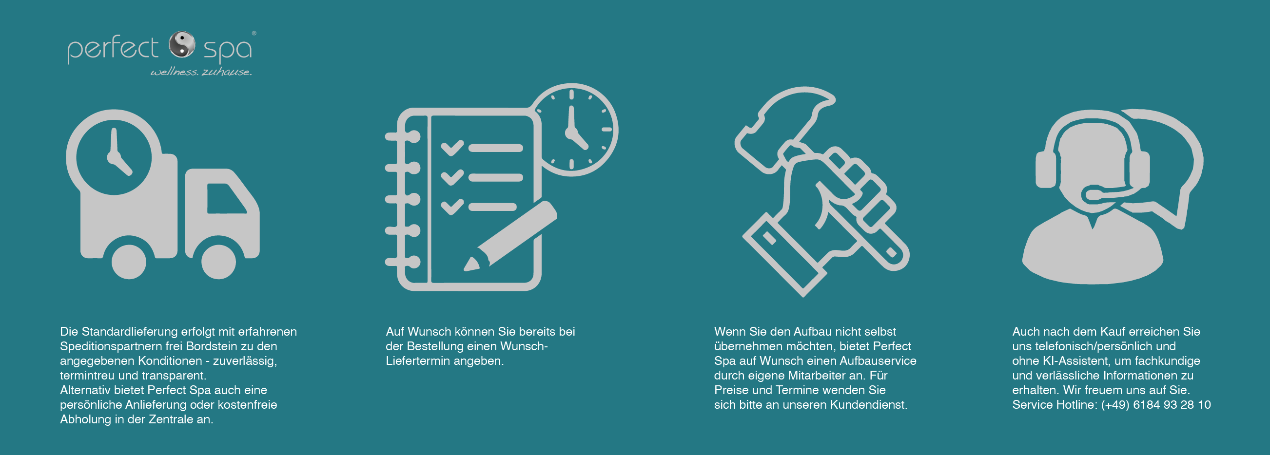 Sollten Sie die Montage dennoch nicht selbst durchführen wollen, bietet Perfect Spa optional einen professionellen Aufbauservice durch eigene, erfahrene Mitarbeiter an. Für eine individuelle Preis- und Terminanfrage wenden Sie sich bitte direkt an unseren Kundendienst.