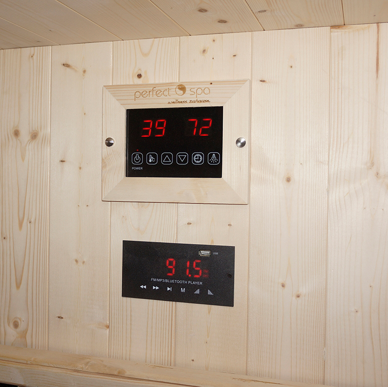 3 kraftvolle Infrarotstrahler im Rücken und 2 an den Waden lassen sich über ein innovatives Control Panel an der Rückwand steuern.