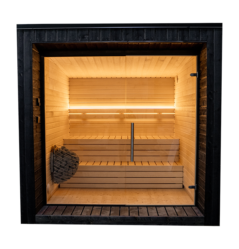 Bereits ab Werk vormontiert und wetterfest behandelt, ist die LUMI Sauna sofort einsatzbereit. Auf Wunsch übernehmen wir auch die vollständige Integration des passenden Saunaofens inklusive Verkabelung – anschlussfertig und komfortabel. So entsteht ein exklusives Rundum-sorglos-Paket: aufstellen, anschließen und direkt entspannen.