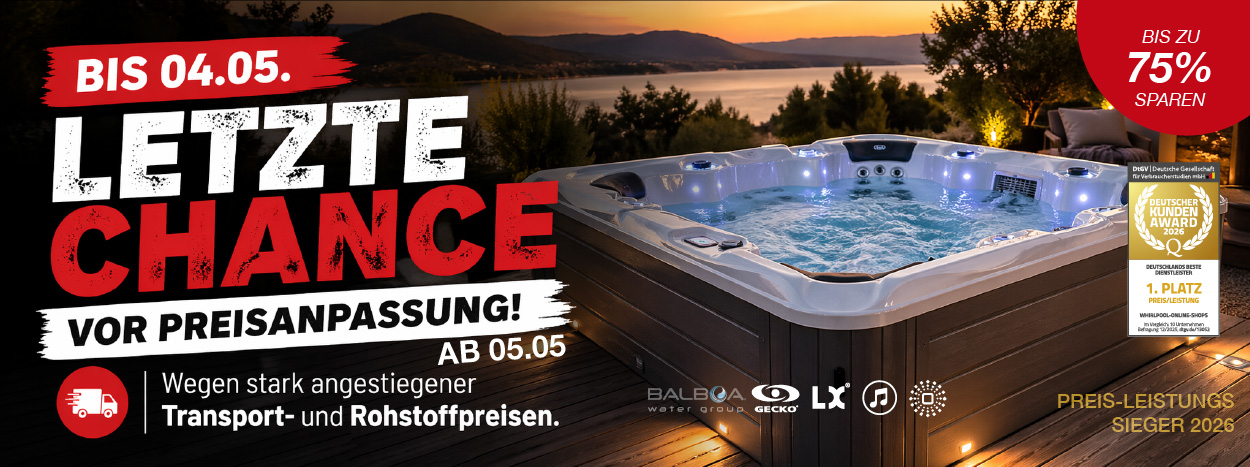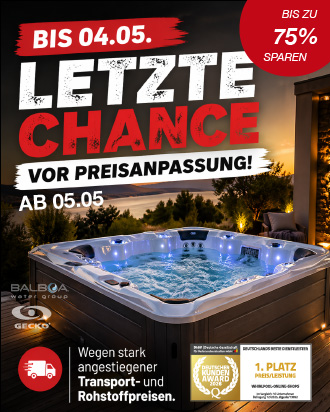 Auf unsere Outdoor-Whirlpools erhalten Sie bis zu 10 Jahre Gewährleistung: auf langlebige Trägerrahmen aus Edelstahl, Aluminium oder korrosionsgeschütztem Stahl sowie auf hochwertige Whirlpoolwannen aus Lucite Acryl® und Aristech Acryl® gegen Materialbruch. Zusätzlich profitieren Sie von 3 Jahren Gewährleistung auf alle Komponenten von Balboa® und Gecko® gemäß den jeweiligen Bedingungen.